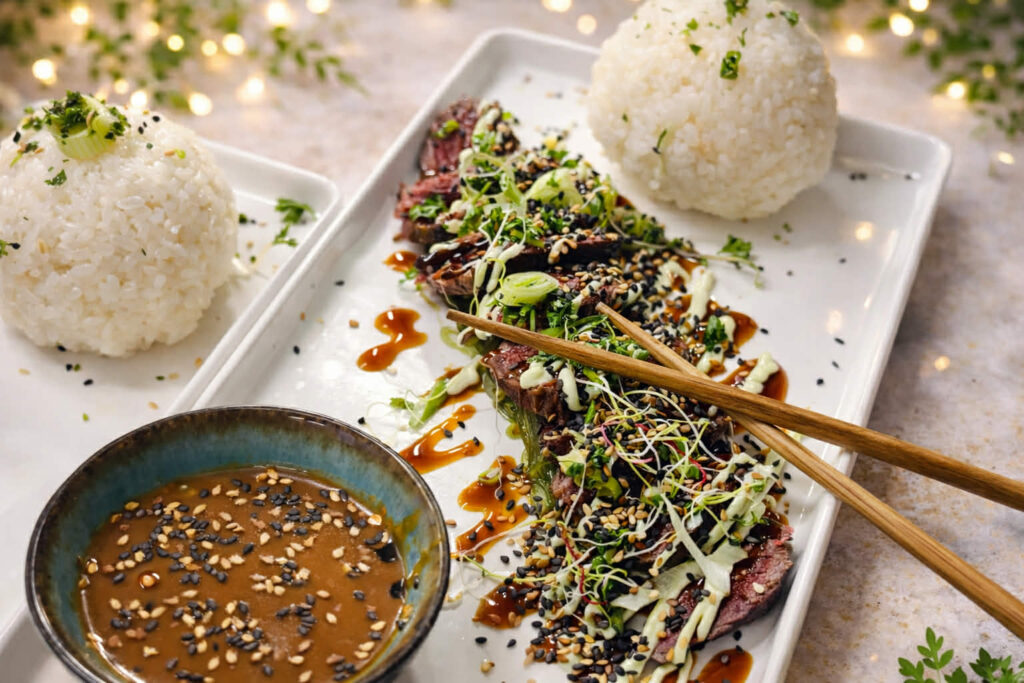 Emincé de bœuf juste saisi, salade de wakamé, sauce teriyaki, mayonnaise wasabi, sésame